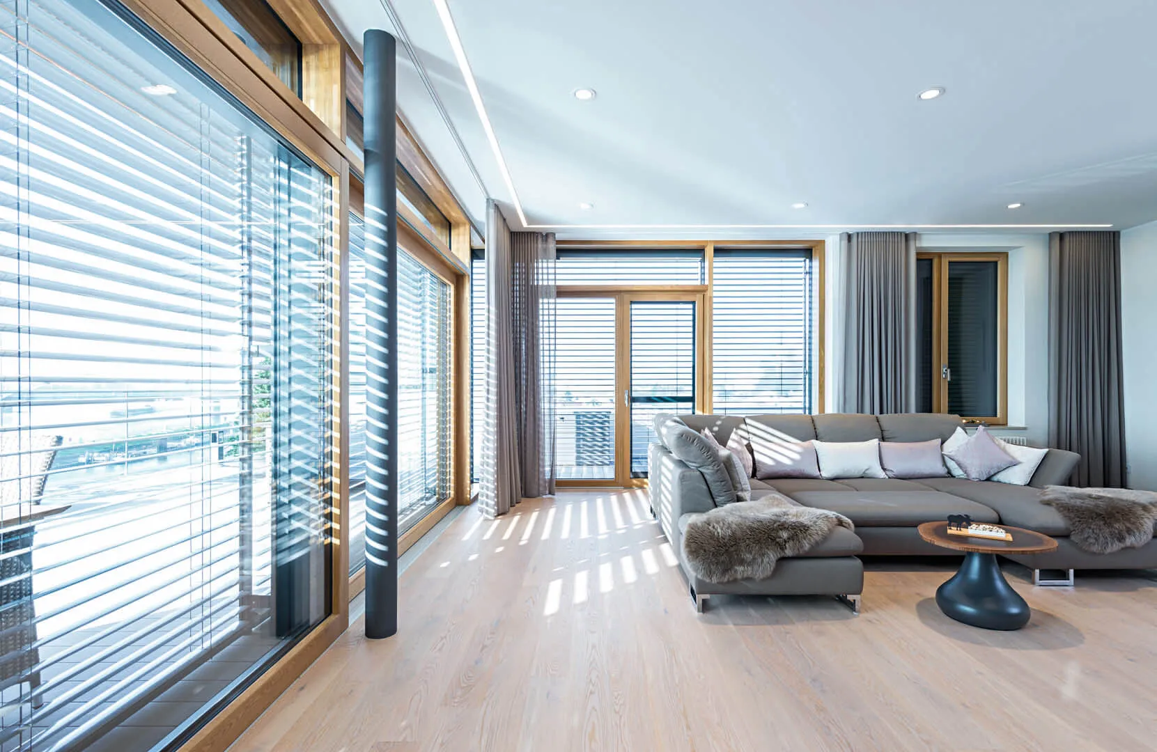 Gerade vor großflächigen Fenstern, bei offener und transparenter Architektur, kommen die Vorzüge von Raffstoren zur Geltung: Die Sonneneinstrahlung wird durch die Aluminiumlamellen reflektiert und das Aufheizen der Räume um bis zu 75 % verhindert.